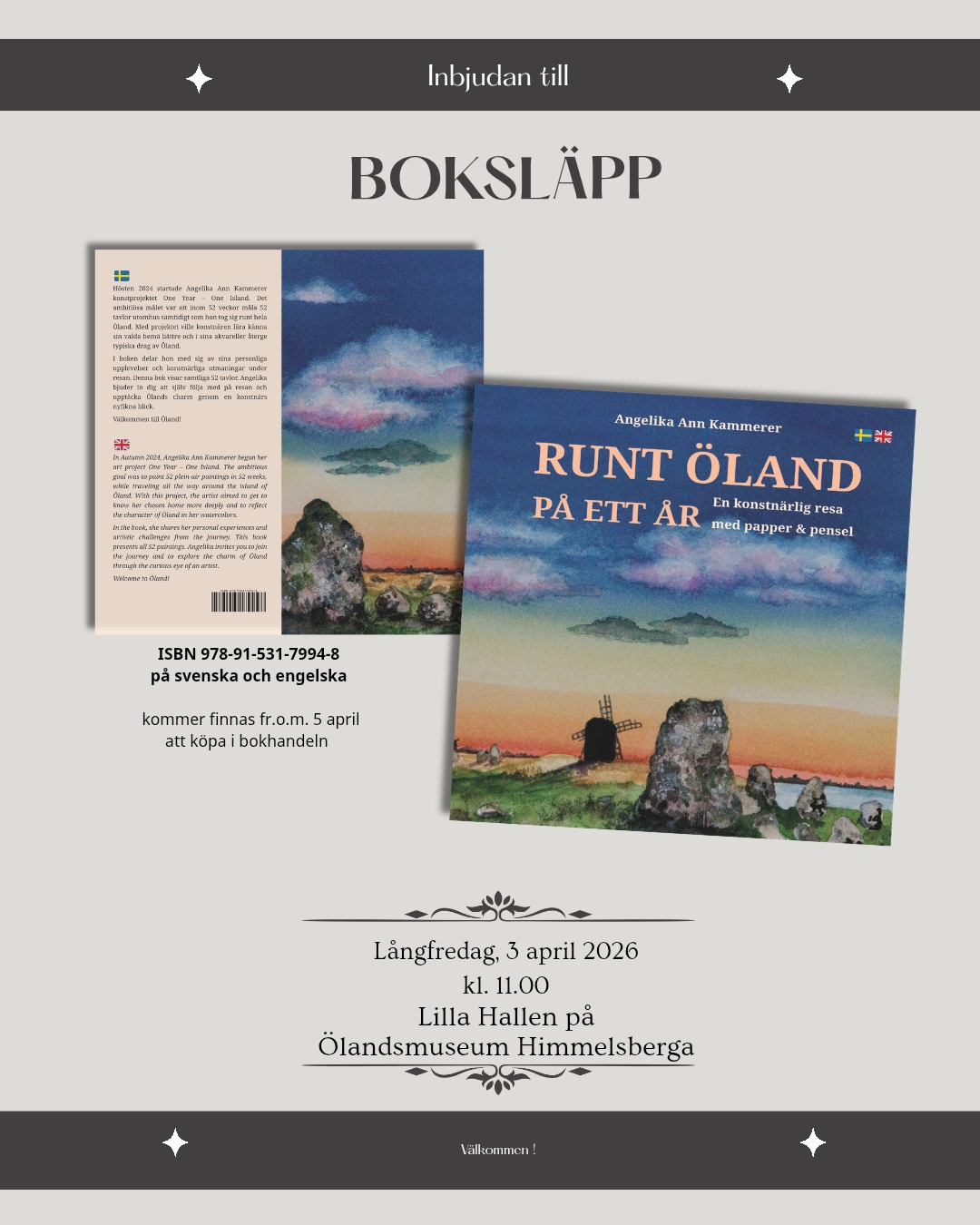 I boken “Runt Öland på ett år” delar Angelika A. Kammerer med sig sina personliga upplevelser och konstnärliga utmaning under en resa runt sin hemö med papper och pensel. I boken visas alla 52 akvareller som hon målade på plats varje vecka i ett år.