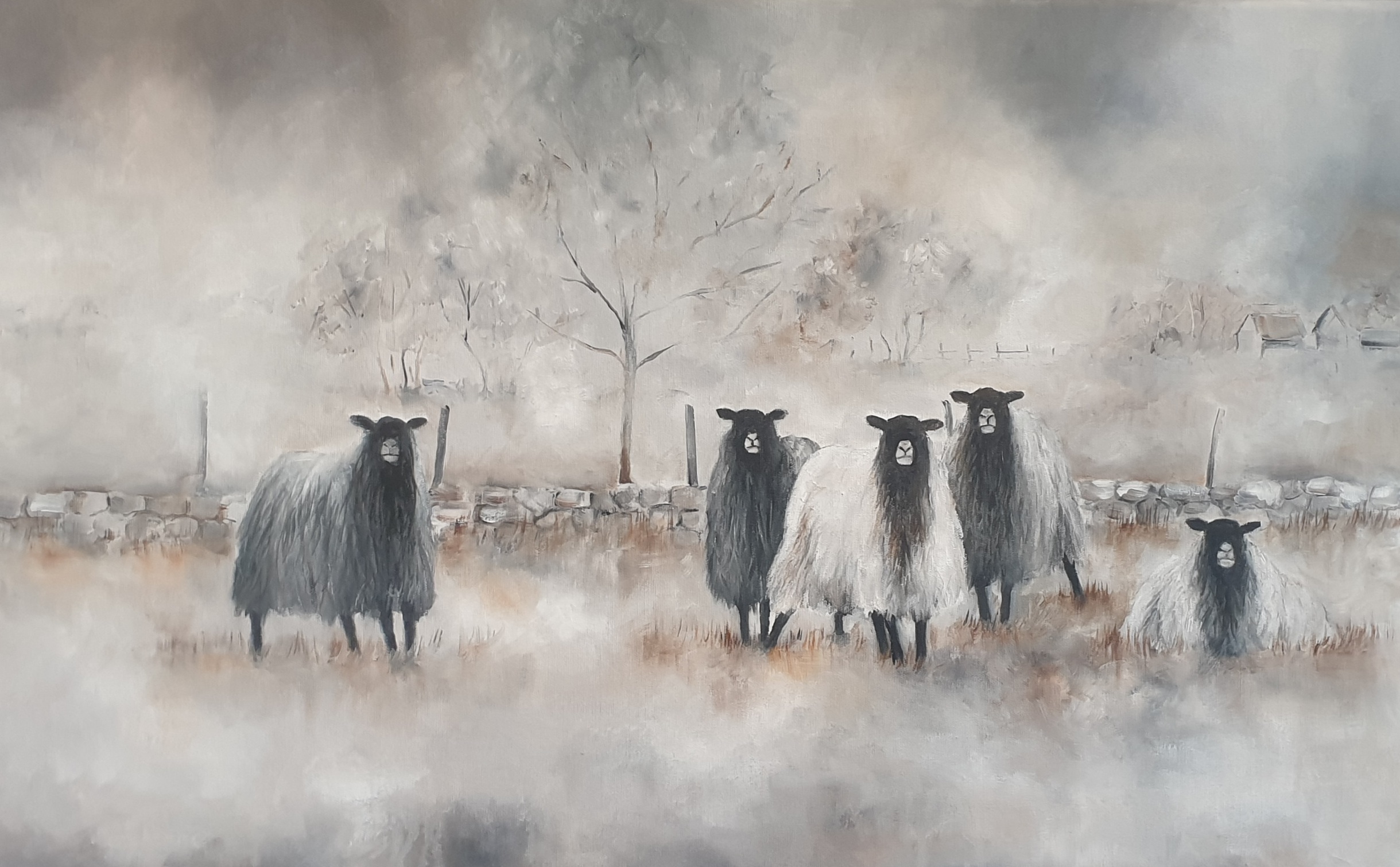 Oljemålningar och akvareller. Naturtrogna motiv i jordnära färger, främst får.
